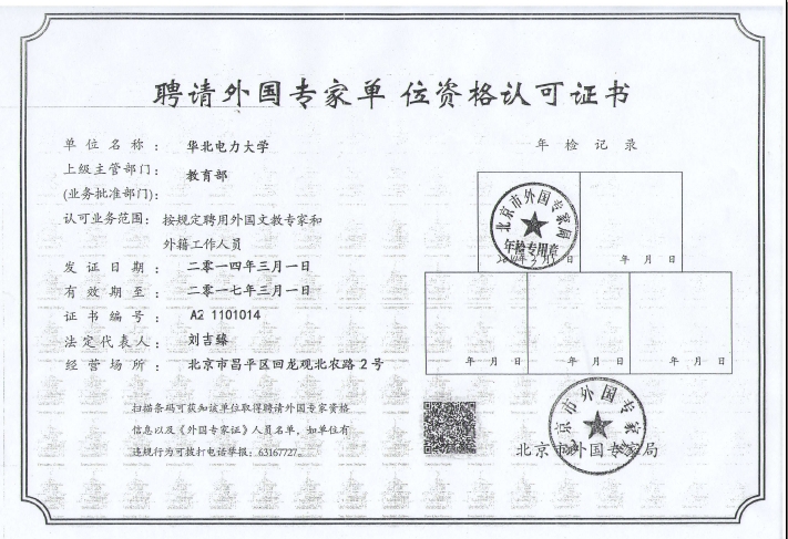 聘请外国专家单位资格认定证书(二)